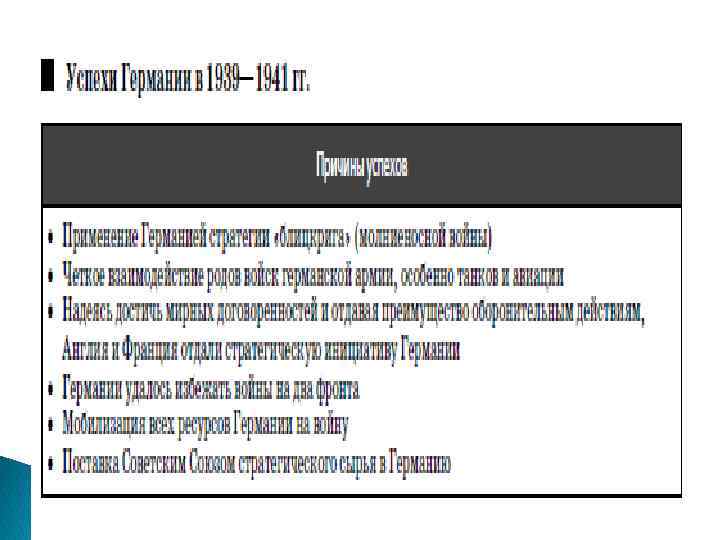 27 сентября 1940 Тройственный пакт: Тройственный пакт – это договор о союзе, подписанный сроком на 10 лет между Германией - Италией – Японией. Суть: 1) договор предусматривал раздел мира между тремя государствами; 2) Германии и Италии предназначалась ведущая роль при создании т. н. нового порядка в Европе, а Японии — в Азии; 3) участники пакта обязались оказывать политическую, экономическую и военную помощь другу.