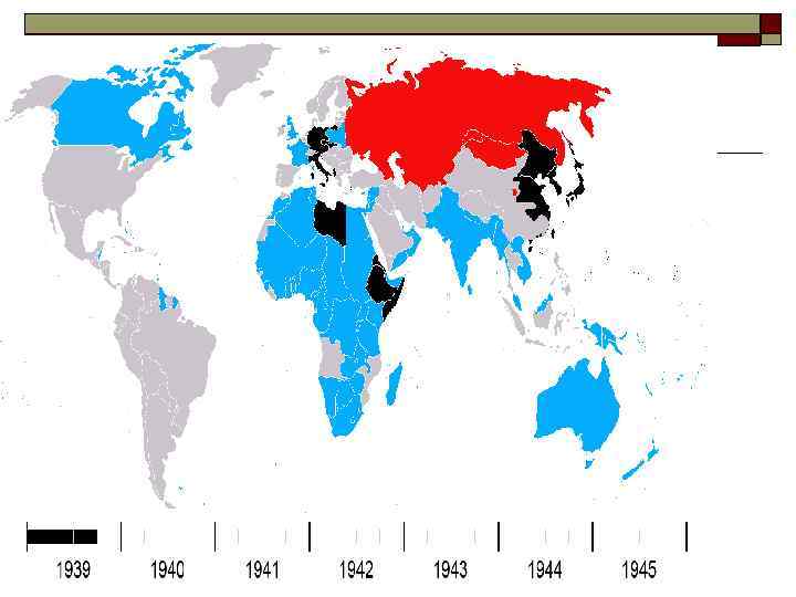 o o o o o Страны Оси: Германия, Италия (до 1943), Япония, Финляндия (до 1944), Болгария (до 1944), Румыния (до 1944), Венгрия (до 1945), Словакия, Таиланд (Сиам), Ирак (до 1941), Иран (до 1941), Маньчжоу-Го, Хорватия. На территории оккупированных стран создавались марионеточные государства, присоединявшиеся к фашистской коалиции: Вишистская Франция, Республика Сало, Сербия, Албания, Черногория, Внутренняя Монголия, Бирма, Филиппины, Вьетнам, Камбоджа, Лаос. На стороне Германии и Японии сражалось также множество коллаборационистских войск, созданных из граждан противоборствующей стороны: РОА, РОНА, иностранные дивизии СС (русская, украинская, эстонская, латышская, датская, бельгийская, французская, албанская), «Свободная Индия» . Также в вооружённых силах стран Оси сражались добровольческие силы государств, формально остававшихся нейтральными: Испании (Голубая дивизия), Швеции и Португалии. o o o В антигитлеровскую коалицию входили: Польша, Великобритания, Франция (с 1939 года), СССР (с 1941 года), США (с 1941 года), Китай, Австралия, Канада, Югославия, Нидерланды, Норвегия, Новая Зеландия, Южно-Африканский Союз, Чехословакия, Бельгия, Греция, Эфиопия, Дания, Бразилия, Мексика, Монголия, Люксембург, Непал, Панама, Аргентина, Чили, Куба, Перу, Гватемала, Колумбия, Коста-Рика, Доминиканская республика, Албания, Гондурас, Сальвадор, Гаити, Парагвай, Эквадор, Сан-Марино, Турция, Уругвай, Венесуэла, Ливан, Саудовская Аравия, Никарагуа, Либерия, Боливия. В ходе войны к ним присоединились некоторые государства, вышедшие из фашистского блока: Иран (с 1941 года), Ирак (с 1943 года), Италия (с 1943 года), Румыния (с 1944 года), Болгария (с 1944 года), Венгрия (в 1945 году), Финляндия (в 1945 году).