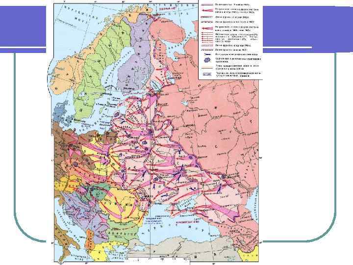 Антигитлеровская коалиция Главной проблемой в отношениях между союзниками был вопрос о сроках открытия второго фронта в Европе. l В ноябре-декабре 1943 г. состоялась Тегеранская конференция – первая встреча Сталина с президентом США Ф. Рузвельтом и премьер-министром Великобритании У. Черчиллем. Были приняты решения о высадке англоамериканского десанта во Франции не позднее мая 1944 г. Советское руководство, в свою очередь, взяло на себя обязательство вступить в войну с Японией через 2 -3 месяца после разгрома немецкого фашизма. l В феврале 1945 г. в Ялте состоялась новая конференция «большой тройки» - Ялтинская или Крымская. Обсуждались вопросы послевоенного устройства Европы. Были приняты решения о создании ООН, о проведении границы между СССР и Польшей по линии Керзона, о выплате Германией репараций, о ее разделе на зоны оккупации между союзниками. l