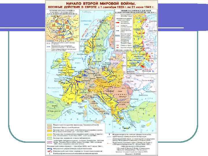 Вторая мировая война l l l l 1 сентября 1939 г. – начало Второй мировой войны (нападение Германии на Польшу) 2 сентября 1945 г. – конец Второй мировой войны Политика «умиротворения агрессора» западных стран Оккупация Дании, Норвегии, Бенилюкса, большей части Франции (оставшаяся часть – режим Виши), война в Северной Африке Вспомнить про Компьенский лес Операция «Морской лев» против Англии, авиационные атаки английских городов Дюнкеркская операция (26 мая-4 июня 1940) – эвакуация морем блокированных англо-франкобельгийских частей