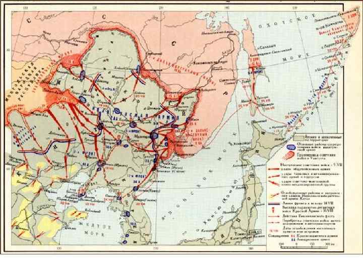Война в Азии В соответствии с союзническими обязательствами, 8 августа 1945 г. СССР объявил войну Японии. Общее руководство операцией осуществлял А. М. Василевский. l Уже 19 августа командование Квантунской армии Японии заявило о готовности сложить оружие, а 2 сентября 1945 г. Япония полностью капитулировала. Вторая мировая война закончилась. l К СССР отошла южная часть Сахалина и. острова Курильской гряды. Сфера его влияния распространилась на Северную Корею и Китай. Однако мирный договор с Японией подписан не был, причиной же этого стали разногласия по поводу государственной принадлежности островов Шикотан, Кунашир, Хабомаи и Итуруп. l