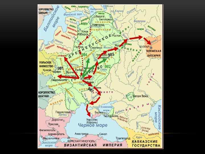 ВНЕШНЯЯ ПОЛИТИКА • Подчинение угро-финских и балтских племён Прибалтики: сбор дани с эстов; • Поход на волжских болгар в 985 г. – закрепление на Волжском торговом пути; • Женитьба на “чехини”, “болгарыни”, “грекини”; • Заключение династических браков: дочь Болеслава Храброго - Святополк, Премислава – Ласло Лысый, Добронега-Мария – Казимир I; • Заключение мирных договоров с Чехией, Византией, Венгрией, Польшей.