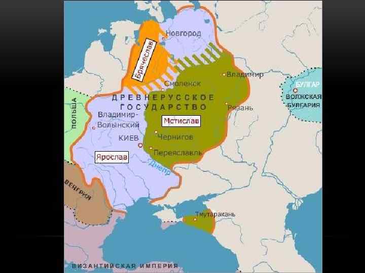 ЕЩЕ МЕЖДОУСОБИЦА…. Действующие лица: Святополк Ярополкович(? ) – наместник в Турове; Борис Владимирович – наместник в Ростове; Глеб Владимирович – наместник в Муроме; Святослав Владимирович – наместник в Овруче; Всеволод Владимирович – наместник во Владимире; Мстислав Владимирович – наместник в Тмутаракани; Изяслав Владимирович – наместник в Полоцке; Ярослав Владимирович – наместник в Новгороде; Что произошло? -“Русский Каин”: убийство Бориса, Глеба, Святоcлава Святополком – 1015 г. ; - Святополк и печенеги VS Ярослав, новгородцы и варяги: Ярослав в Киеве – 1016 г. ; - Неудачная Осада Киева Святополком – 1017 г. ; - Болеслав I Храбрый и Святополк громят Ярослава на р. Буг: Святополк в Киева – 1018 г. ; - Битва на Альте (1019): Ярослав опять в Киеве, а Ярополк опять бежит; - 1026 – 1036 гг. : Раздел по Днепру Древнерусского государства между Ярославом и Мстиславом.