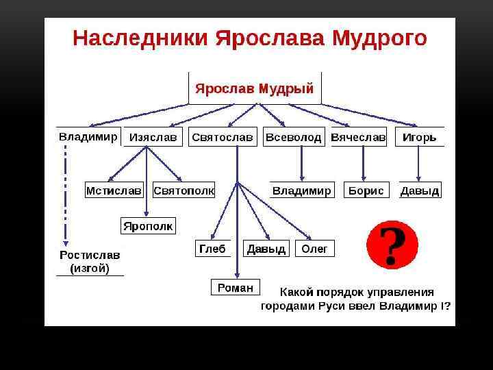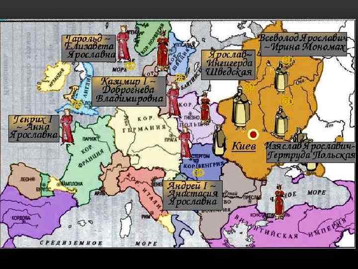 ДАВАЙ ПОЖЕНИМСЯ ИЛИ ДИНАСТИЧЕСКИЕ БРАКИ С ЕВРОПЕЙСКИМИ ДВОРАМИ • Елизавета вышла за норвежского короля Харальда Сурового; • Анастасия вышла за венгерского короля Андрея I; • Анна вышла за французского короля Генриха I; • Изяслав женился на сестре польского короля Казимира I – Гертруде; • Всеволод женился на дочери византийского императора Констатина Мономаха –Ирине; • Святослав во втором браке женился на австрийской принцессе Оде, дочери Леопольда.