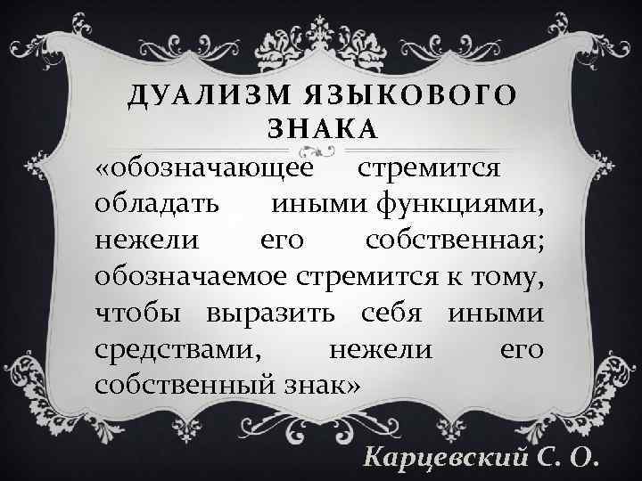 ДУАЛИЗМ ЯЗЫКОВОГО ЗНАКА «обозначающее стремится обладать иными функциями, нежели его собственная; обозначаемое стремится к тому, чтобы выразить себя иными средствами, нежели его собственный знак» Карцевский С. О.