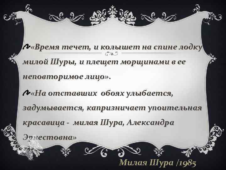«Время течет, и колышет на спине лодку милой Шуры, и плещет морщинами в ее неповторимое лицо» . «На отставших обоях улыбается, задумывается, капризничает упоительная красавица - милая Шура, Александра Эрнестовна» Милая Шура /1985