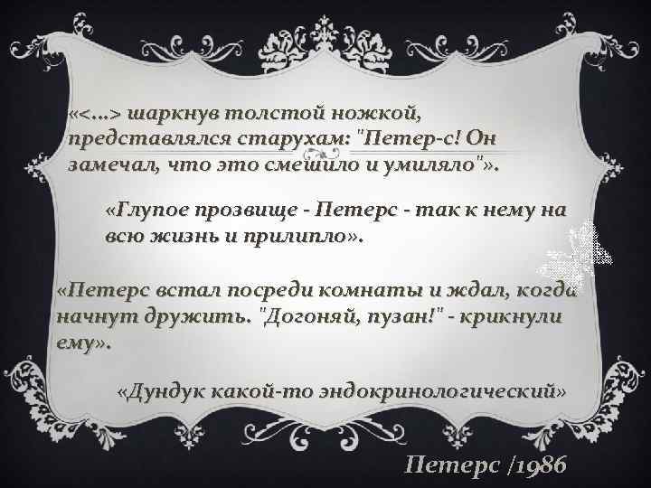 «<. . . > шаркнув толстой ножкой, представлялся старухам: "Петер-с! Он замечал, что это смешило и умиляло"» . «Глупое прозвище - Петерс - так к нему на всю жизнь и прилипло» . «Петерс встал посреди комнаты и ждал, когда начнут дружить. "Догоняй, пузан!" - крикнули ему» . «Дундук какой-то эндокринологический» Петерс /1986