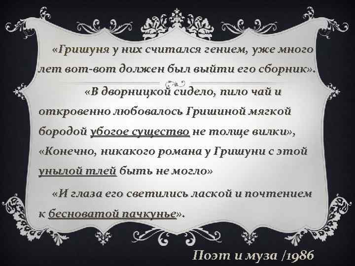 «Гришуня у них считался гением, уже много лет вот-вот должен был выйти его сборник» . «В дворницкой сидело, пило чай и откровенно любовалось Гришиной мягкой бородой убогое существо не толще вилки» , «Конечно, никакого романа у Гришуни с этой унылой тлей быть не могло» «И глаза его светились лаской и почтением к бесноватой пачкунье» . Поэт и муза /1986