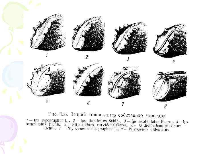 Шестизубый короед, стенограф • Вредитель хвойных лесов. На каждом краю «тачки» 6 зубцов. Маточные ходы звездчатые, личиночные – короткие. • Личинки окукливаются в коре. Генерация одногодичная. Вылет жуков осно-вного поколения в июле, сестринского в августе. • Жуки зимуют в коре, лесной подстилке.