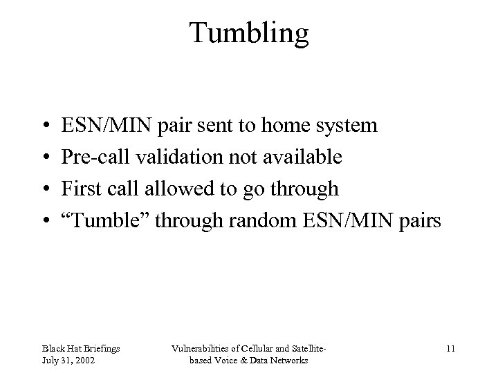 Tumbling • • ESN/MIN pair sent to home system Pre-call validation not available First call allowed to go through “Tumble” through random ESN/MIN pairs Black Hat Briefings July 31, 2002 Vulnerabilities of Cellular and Satellitebased Voice & Data Networks 11