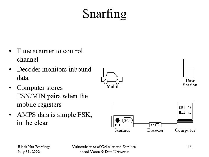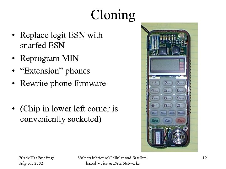 Cloning • Replace legit ESN with snarfed ESN • Reprogram MIN • “Extension” phones • Rewrite phone firmware • (Chip in lower left corner is conveniently socketed) Black Hat Briefings July 31, 2002 Vulnerabilities of Cellular and Satellitebased Voice & Data Networks 12