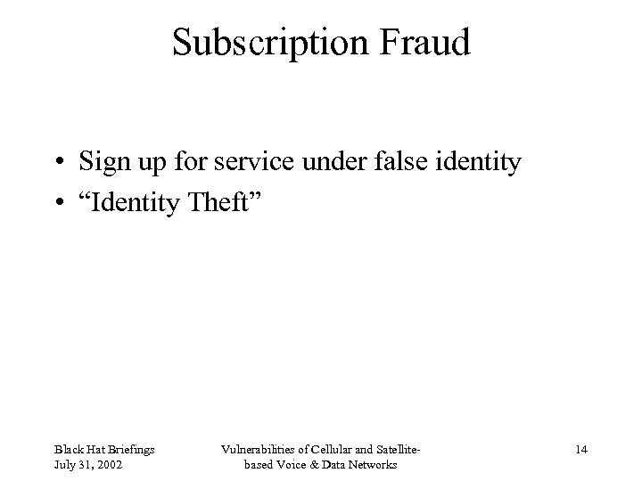 Snarfing • Tune scanner to control channel • Decoder monitors inbound data • Computer stores ESN/MIN pairs when the mobile registers • AMPS data is simple FSK, in the clear Black Hat Briefings July 31, 2002 Vulnerabilities of Cellular and Satellitebased Voice & Data Networks 13