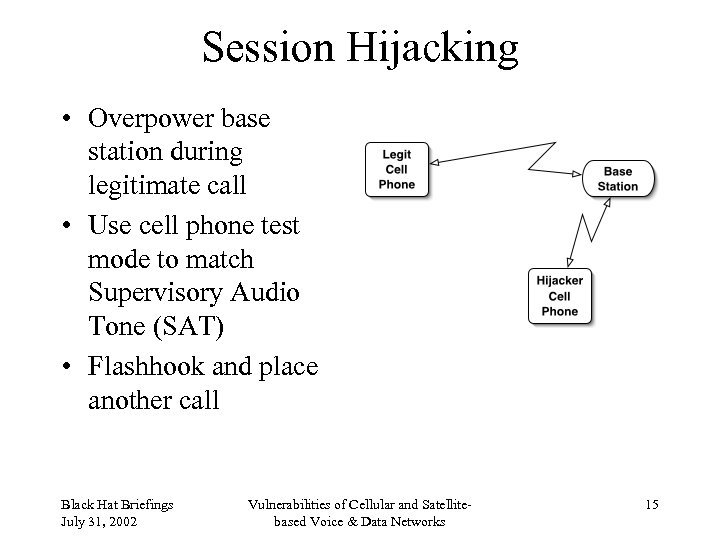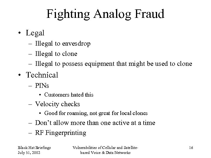 Session Hijacking • Overpower base station during legitimate call • Use cell phone test mode to match Supervisory Audio Tone (SAT) • Flashhook and place another call Black Hat Briefings July 31, 2002 Vulnerabilities of Cellular and Satellitebased Voice & Data Networks 15