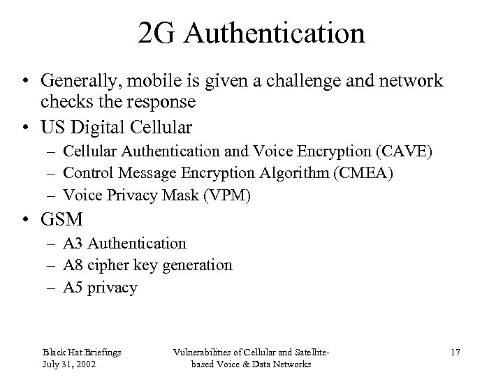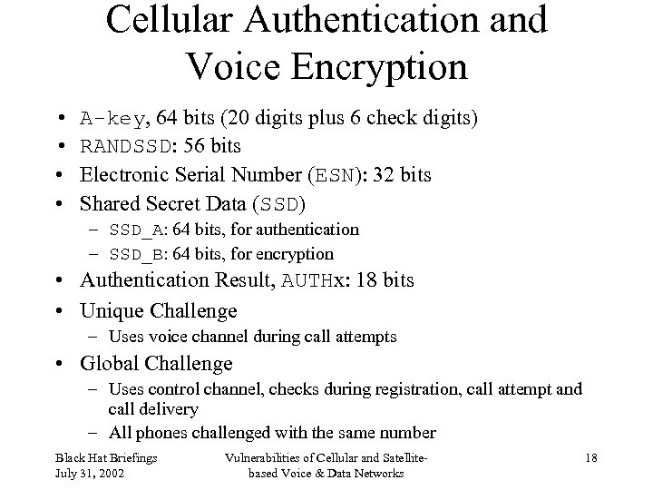2 G Authentication • Generally, mobile is given a challenge and network checks the response • US Digital Cellular – Cellular Authentication and Voice Encryption (CAVE) – Control Message Encryption Algorithm (CMEA) – Voice Privacy Mask (VPM) • GSM – A 3 Authentication – A 8 cipher key generation – A 5 privacy Black Hat Briefings July 31, 2002 Vulnerabilities of Cellular and Satellitebased Voice & Data Networks 17