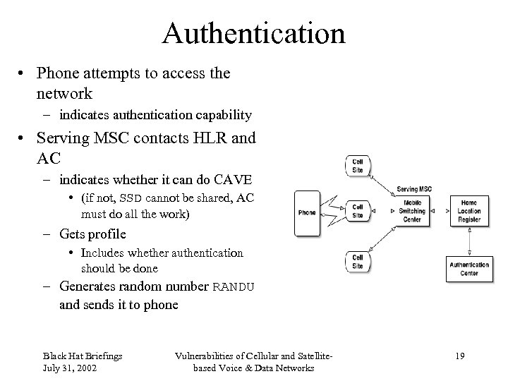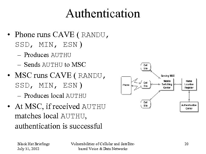 Authentication • Phone attempts to access the network – indicates authentication capability • Serving MSC contacts HLR and AC – indicates whether it can do CAVE • (if not, SSD cannot be shared, AC must do all the work) – Gets profile • Includes whether authentication should be done – Generates random number RANDU and sends it to phone Black Hat Briefings July 31, 2002 Vulnerabilities of Cellular and Satellitebased Voice & Data Networks 19