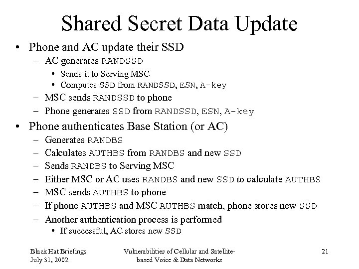 Shared Secret Data Update • Phone and AC update their SSD – AC generates RANDSSD • Sends it to Serving MSC • Computes SSD from RANDSSD, ESN, A-key – MSC sends RANDSSD to phone – Phone generates SSD from RANDSSD, ESN, A-key • Phone authenticates Base Station (or AC) – – – – Generates RANDBS Calculates AUTHBS from RANDBS and new SSD Sends RANDBS to Serving MSC Either MSC or AC uses RANDBS and new SSD to calculate AUTHBS MSC sends AUTHBS to phone If phone AUTHBS and MSC AUTHBS match, phone stores new SSD Another authentication process is performed • If successful, AC stores new SSD Black Hat Briefings July 31, 2002 Vulnerabilities of Cellular and Satellitebased Voice & Data Networks 21