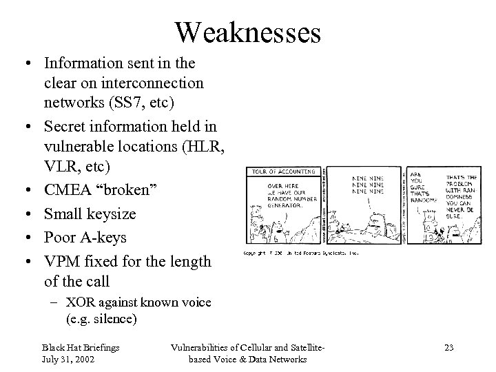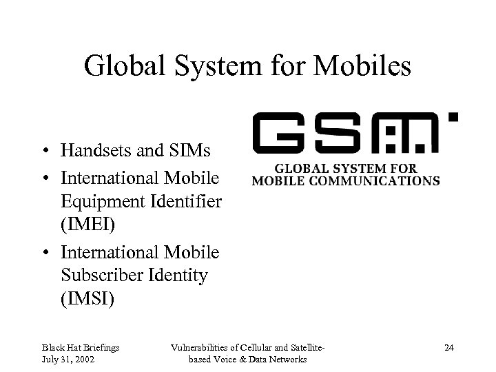 Weaknesses • Information sent in the clear on interconnection networks (SS 7, etc) • Secret information held in vulnerable locations (HLR, VLR, etc) • CMEA “broken” • Small keysize • Poor A-keys • VPM fixed for the length of the call – XOR against known voice (e. g. silence) Black Hat Briefings July 31, 2002 Vulnerabilities of Cellular and Satellitebased Voice & Data Networks 23