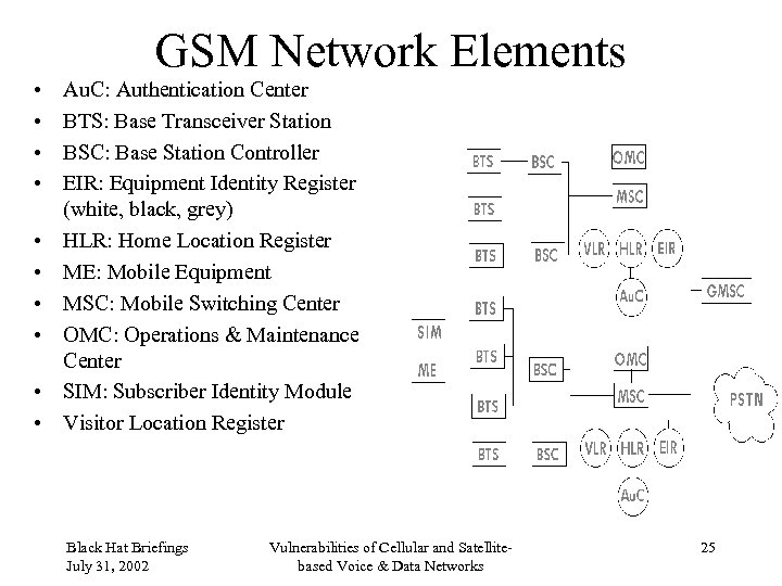 Global System for Mobiles • Handsets and SIMs • International Mobile Equipment Identifier (IMEI) • International Mobile Subscriber Identity (IMSI) Black Hat Briefings July 31, 2002 Vulnerabilities of Cellular and Satellitebased Voice & Data Networks 24