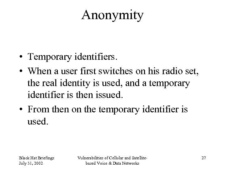 Anonymity • Temporary identifiers. • When a user first switches on his radio set, the real identity is used, and a temporary identifier is then issued. • From then on the temporary identifier is used. Black Hat Briefings July 31, 2002 Vulnerabilities of Cellular and Satellitebased Voice & Data Networks 27
