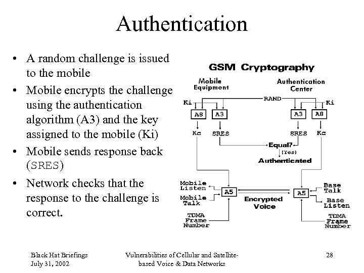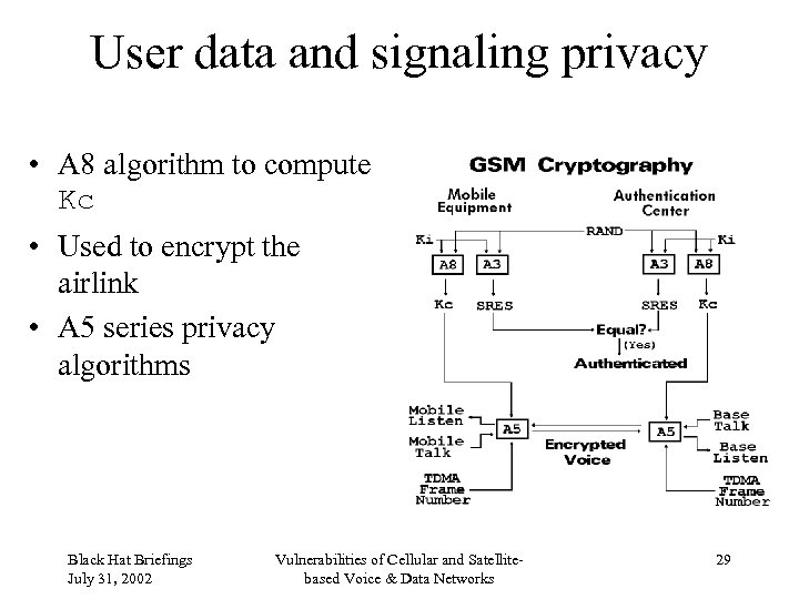 Authentication • A random challenge is issued to the mobile • Mobile encrypts the challenge using the authentication algorithm (A 3) and the key assigned to the mobile (Ki) • Mobile sends response back (SRES) • Network checks that the response to the challenge is correct. Black Hat Briefings July 31, 2002 Vulnerabilities of Cellular and Satellitebased Voice & Data Networks 28