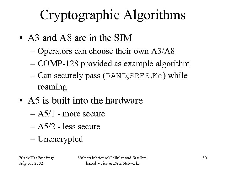 User data and signaling privacy • A 8 algorithm to compute Kc • Used to encrypt the airlink • A 5 series privacy algorithms Black Hat Briefings July 31, 2002 Vulnerabilities of Cellular and Satellitebased Voice & Data Networks 29