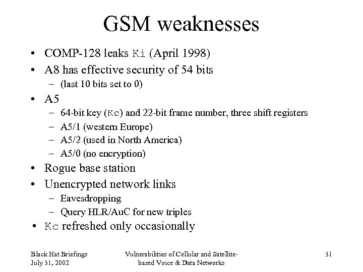Cryptographic Algorithms • A 3 and A 8 are in the SIM – Operators can choose their own A 3/A 8 – COMP-128 provided as example algorithm – Can securely pass (RAND, SRES, Kc) while roaming • A 5 is built into the hardware – A 5/1 - more secure – A 5/2 - less secure – Unencrypted Black Hat Briefings July 31, 2002 Vulnerabilities of Cellular and Satellitebased Voice & Data Networks 30