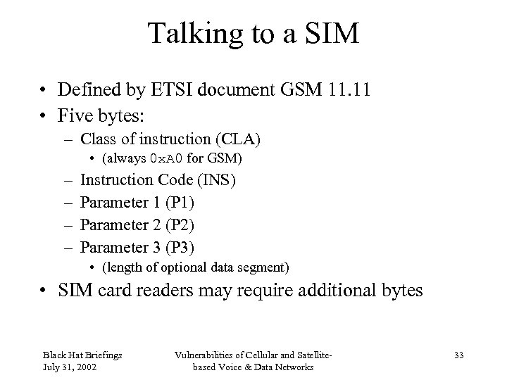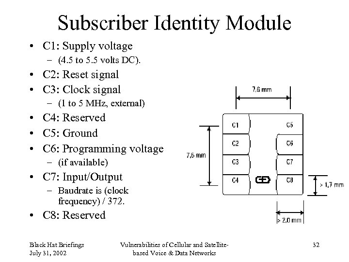 Subscriber Identity Module • C 1: Supply voltage – (4. 5 to 5. 5 volts DC). • C 2: Reset signal • C 3: Clock signal – (1 to 5 MHz, external) • C 4: Reserved • C 5: Ground • C 6: Programming voltage – (if available) • C 7: Input/Output – Baudrate is (clock frequency) / 372. • C 8: Reserved Black Hat Briefings July 31, 2002 Vulnerabilities of Cellular and Satellitebased Voice & Data Networks 32