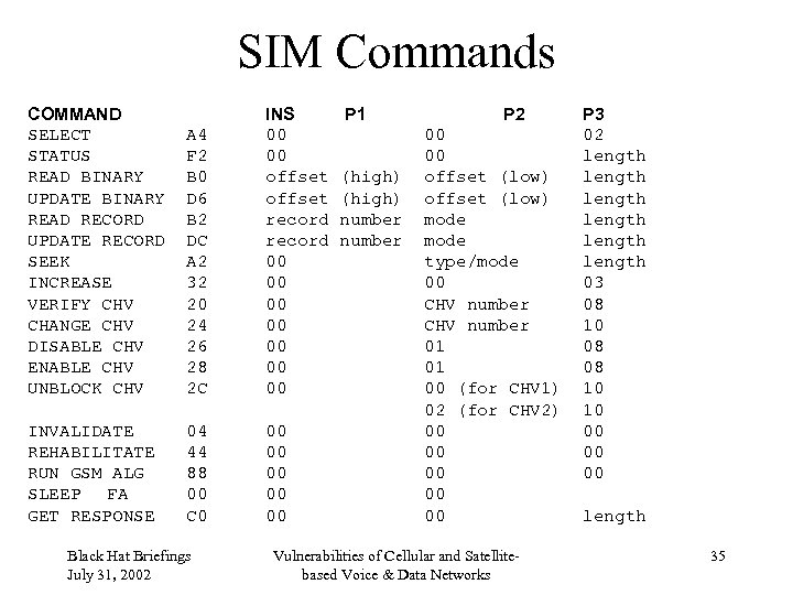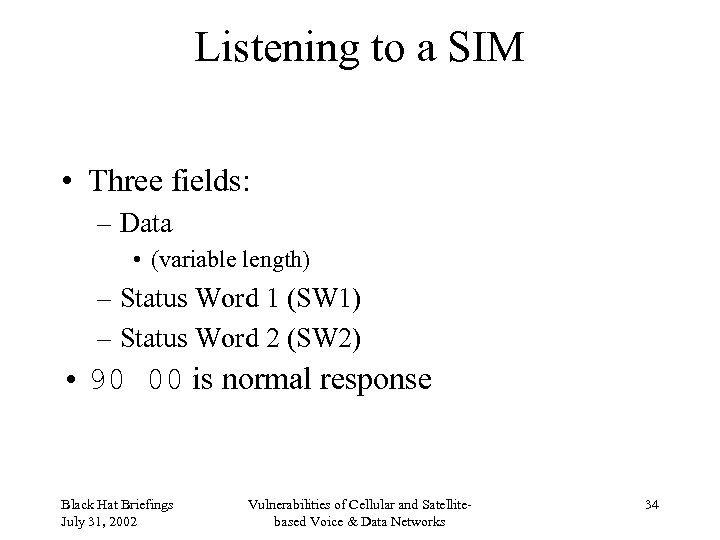 Talking to a SIM • Defined by ETSI document GSM 11. 11 • Five bytes: – Class of instruction (CLA) • (always 0 x. A 0 for GSM) – – Instruction Code (INS) Parameter 1 (P 1) Parameter 2 (P 2) Parameter 3 (P 3) • (length of optional data segment) • SIM card readers may require additional bytes Black Hat Briefings July 31, 2002 Vulnerabilities of Cellular and Satellitebased Voice & Data Networks 33
