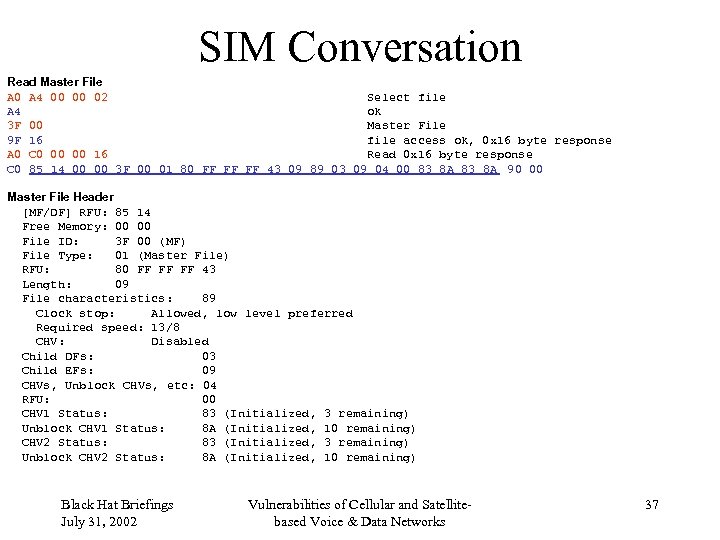 SIM Conversation Setup card for access Activating card. . . 01 Sending ATR 1. . . Sending Inverse ATR 1. . . 3 F 2 F 00 80 69 AF 02 04 01 31 00 00 00 0 E 83 3 E 9 F 16 Black Hat Briefings July 31, 2002 Vulnerabilities of Cellular and Satellitebased Voice & Data Networks 36