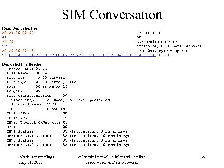 SIM Conversation Read Master File A 0 A 4 00 00 02 Select file A 4 ok 3 F 00 Master File 9 F 16 file access ok, 0 x 16 byte response A 0 C 0 00 00 16 Read 0 x 16 byte response C 0 85 14 00 00 3 F 00 01 80 FF FF FF 43 09 89 03 09 04 00 83 8 A 90 00 Master File Header [MF/DF] RFU: 85 14 Free Memory: 00 00 File ID: 3 F 00 (MF) File Type: 01 (Master File) RFU: 80 FF FF FF 43 Length: 09 File characteristics: 89 Clock stop: Allowed, low level preferred Required speed: 13/8 CHV: Disabled Child DFs: 03 Child EFs: 09 CHVs, Unblock CHVs, etc: 04 RFU: 00 CHV 1 Status: 83 (Initialized, 3 remaining) Unblock CHV 1 Status: 8 A (Initialized, 10 remaining) CHV 2 Status: 83 (Initialized, 3 remaining) Unblock CHV 2 Status: 8 A (Initialized, 10 remaining) Black Hat Briefings July 31, 2002 Vulnerabilities of Cellular and Satellitebased Voice & Data Networks 37