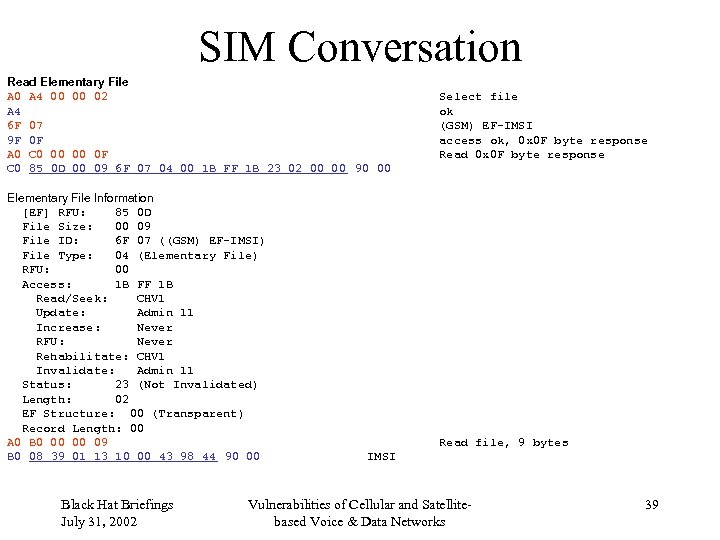 SIM Conversation Read Dedicated File A 0 A 4 00 00 02 A 4 7 F 20 9 F 16 A 0 C 0 00 00 16 C 0 85 14 00 04 7 F 20 02 00 FF FB FF 23 09 99 00 19 04 00 83 Select file ok GSM Dedicated File access ok, 0 x 16 byte response Read 0 x 16 byte response 8 A 83 8 A 90 00 Dedicated File Header [MF/DF] RFU: 85 14 Free Memory: 00 04 File ID: 7 F 20 (DF-GSM) File Type: 02 (Directory File) RFU: 00 FF FB FF 23 Length: 09 File characteristics: 99 Clock stop: Allowed, low level preferred Required speed: 13/8 CHV: Disabled Child DFs: 00 Child EFs: 19 CHVs, Unblock CHVs, etc: 04 RFU: 00 CHV 1 Status: 83 (Initialized, 3 remaining) Unblock CHV 1 Status: 8 A (Initialized, 10 remaining) CHV 2 Status: 83 (Initialized, 3 remaining) Unblock CHV 2 Status: 8 A (Initialized, 10 remaining) Black Hat Briefings July 31, 2002 Vulnerabilities of Cellular and Satellitebased Voice & Data Networks 38