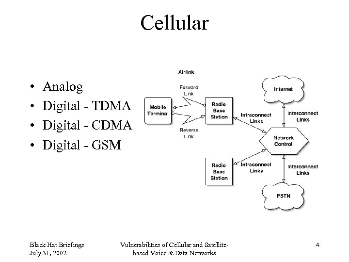 Cellular • • Analog Digital - TDMA Digital - CDMA Digital - GSM Black Hat Briefings July 31, 2002 Vulnerabilities of Cellular and Satellitebased Voice & Data Networks 4