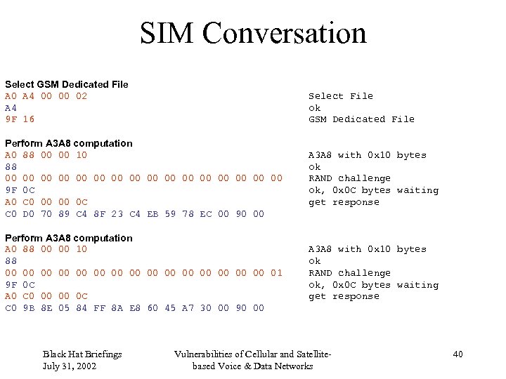 SIM Conversation Read Elementary File A 0 A 4 00 00 02 A 4 6 F 07 9 F 0 F A 0 C 0 00 00 0 F C 0 85 0 D 00 09 6 F 07 04 00 1 B FF 1 B 23 02 00 00 90 00 Elementary File Information [EF] RFU: 85 0 D File Size: 00 09 File ID: 6 F 07 ((GSM) EF-IMSI) File Type: 04 (Elementary File) RFU: 00 Access: 1 B FF 1 B Read/Seek: CHV 1 Update: Admin 11 Increase: Never RFU: Never Rehabilitate: CHV 1 Invalidate: Admin 11 Status: 23 (Not Invalidated) Length: 02 EF Structure: 00 (Transparent) Record Length: 00 A 0 B 0 00 00 09 B 0 08 39 01 13 10 00 43 98 44 90 00 Black Hat Briefings July 31, 2002 Select file ok (GSM) EF-IMSI access ok, 0 x 0 F byte response Read file, 9 bytes IMSI Vulnerabilities of Cellular and Satellitebased Voice & Data Networks 39