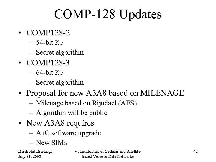 COMP-128 Updates • COMP 128 -2 – 54 -bit Kc – Secret algorithm • COMP 128 -3 – 64 -bit Kc – Secret algorithm • Proposal for new A 3 A 8 based on MILENAGE – Milenage based on Rijndael (AES) – Algorithm will be public • New A 3 A 8 requires – Au. C software upgrade – New SIMs Black Hat Briefings July 31, 2002 Vulnerabilities of Cellular and Satellitebased Voice & Data Networks 42