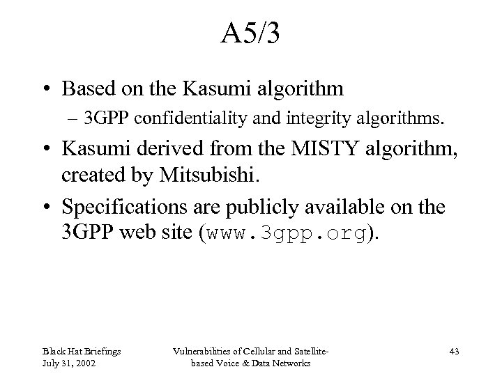 A 5/3 • Based on the Kasumi algorithm – 3 GPP confidentiality and integrity algorithms. • Kasumi derived from the MISTY algorithm, created by Mitsubishi. • Specifications are publicly available on the 3 GPP web site (www. 3 gpp. org). Black Hat Briefings July 31, 2002 Vulnerabilities of Cellular and Satellitebased Voice & Data Networks 43
