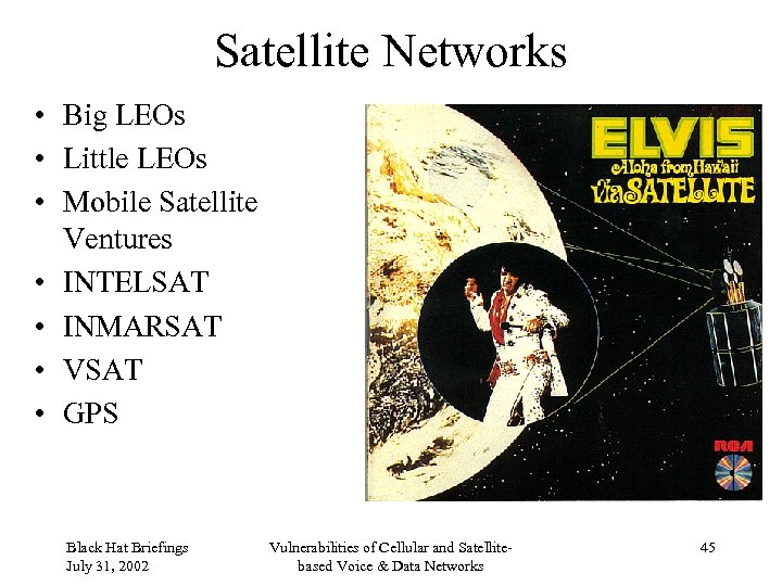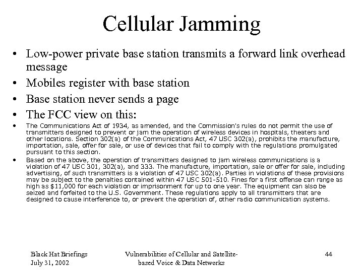 Cellular Jamming • Low-power private base station transmits a forward link overhead message • Mobiles register with base station • Base station never sends a page • The FCC view on this: • • The Communications Act of 1934, as amended, and the Commission's rules do not permit the use of transmitters designed to prevent or jam the operation of wireless devices in hospitals, theaters and other locations. Section 302(a) of the Communications Act, 47 USC 302(a), prohibits the manufacture, importation, sale, offer for sale, or use of devices that fail to comply with the regulations promulgated pursuant to this section. Based on the above, the operation of transmitters designed to jam wireless communications is a violation of 47 USC 301, 302(a), and 333. The manufacture, importation, sale or offer for sale, including advertising, of such transmitters is a violation of 47 USC 302(a). Parties in violations of these provisions may be subject to the penalties contained within 47 USC 501 -510. Fines for a first offense can range as high as $11, 000 for each violation or imprisonment for up to one year. The equipment can also be seized and forfeited to the U. S. Government. These regulations apply to all transmitters that are designed to cause interference to, or prevent the operation of, other radio communication systems. Black Hat Briefings July 31, 2002 Vulnerabilities of Cellular and Satellitebased Voice & Data Networks 44