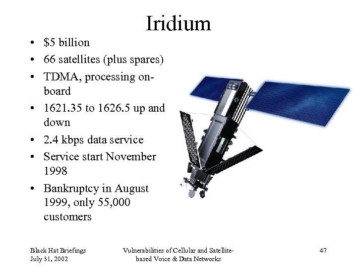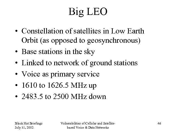 Big LEO • Constellation of satellites in Low Earth Orbit (as opposed to geosynchronous) • Base stations in the sky • Linked to network of ground stations • Voice as primary service • 1610 to 1626. 5 MHz up • 2483. 5 to 2500 MHz down Black Hat Briefings July 31, 2002 Vulnerabilities of Cellular and Satellitebased Voice & Data Networks 46