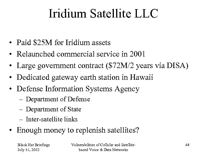Iridium • $5 billion • 66 satellites (plus spares) • TDMA, processing onboard • 1621. 35 to 1626. 5 up and down • 2. 4 kbps data service • Service start November 1998 • Bankruptcy in August 1999, only 55, 000 customers Black Hat Briefings July 31, 2002 Vulnerabilities of Cellular and Satellitebased Voice & Data Networks 47