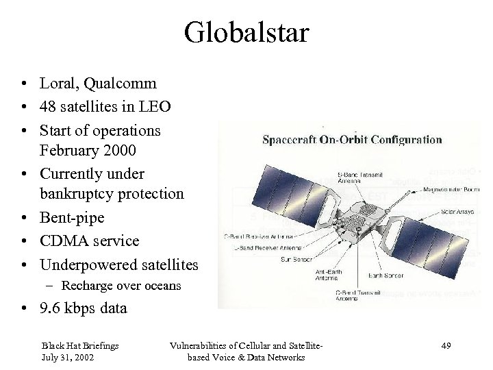 Globalstar • Loral, Qualcomm • 48 satellites in LEO • Start of operations February 2000 • Currently under bankruptcy protection • Bent-pipe • CDMA service • Underpowered satellites – Recharge over oceans • 9. 6 kbps data Black Hat Briefings July 31, 2002 Vulnerabilities of Cellular and Satellitebased Voice & Data Networks 49