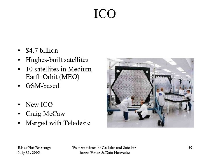 ICO • $4. 7 billion • Hughes-built satellites • 10 satellites in Medium Earth Orbit (MEO) • GSM-based • New ICO • Craig Mc. Caw • Merged with Teledesic Black Hat Briefings July 31, 2002 Vulnerabilities of Cellular and Satellitebased Voice & Data Networks 50