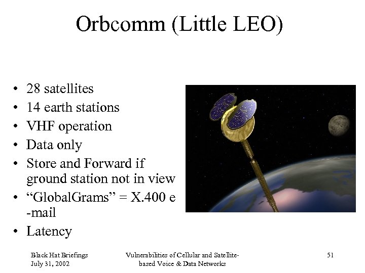 Orbcomm (Little LEO) • • • 28 satellites 14 earth stations VHF operation Data only Store and Forward if ground station not in view • “Global. Grams” = X. 400 e -mail • Latency Black Hat Briefings July 31, 2002 Vulnerabilities of Cellular and Satellitebased Voice & Data Networks 51