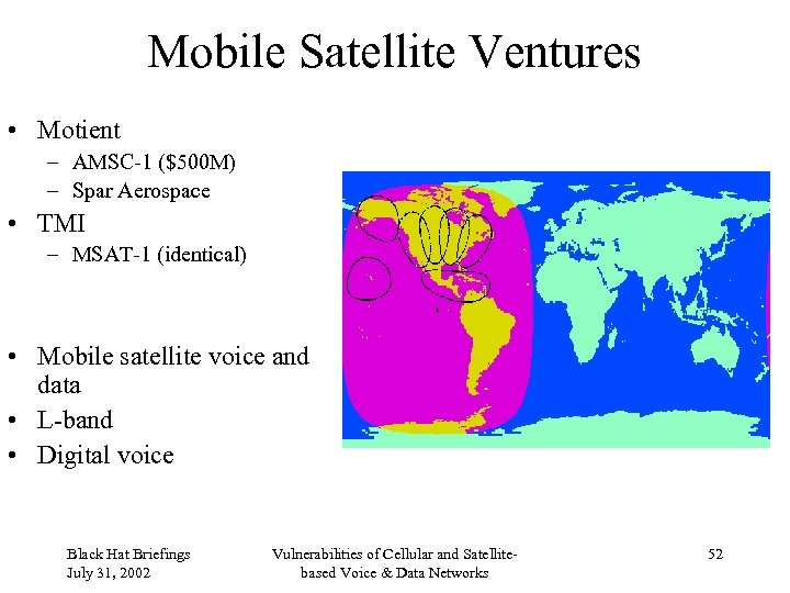 Mobile Satellite Ventures • Motient – AMSC-1 ($500 M) – Spar Aerospace • TMI – MSAT-1 (identical) • Mobile satellite voice and data • L-band • Digital voice Black Hat Briefings July 31, 2002 Vulnerabilities of Cellular and Satellitebased Voice & Data Networks 52