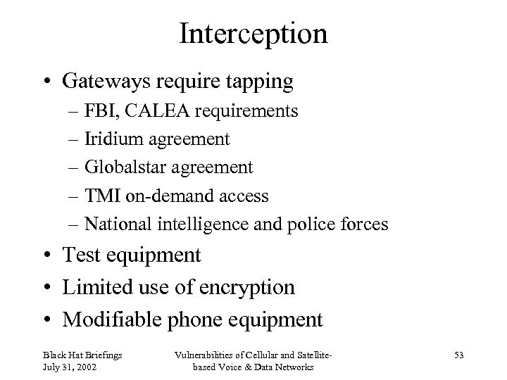 Interception • Gateways require tapping – FBI, CALEA requirements – Iridium agreement – Globalstar agreement – TMI on-demand access – National intelligence and police forces • Test equipment • Limited use of encryption • Modifiable phone equipment Black Hat Briefings July 31, 2002 Vulnerabilities of Cellular and Satellitebased Voice & Data Networks 53