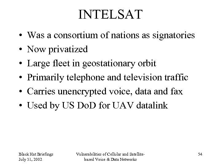 INTELSAT • • • Was a consortium of nations as signatories Now privatized Large fleet in geostationary orbit Primarily telephone and television traffic Carries unencrypted voice, data and fax Used by US Do. D for UAV datalink Black Hat Briefings July 31, 2002 Vulnerabilities of Cellular and Satellitebased Voice & Data Networks 54