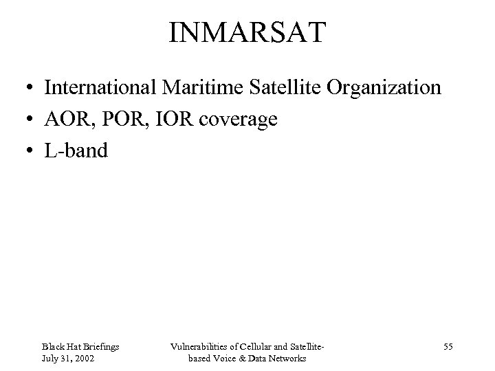 INMARSAT • International Maritime Satellite Organization • AOR, POR, IOR coverage • L-band Black Hat Briefings July 31, 2002 Vulnerabilities of Cellular and Satellitebased Voice & Data Networks 55