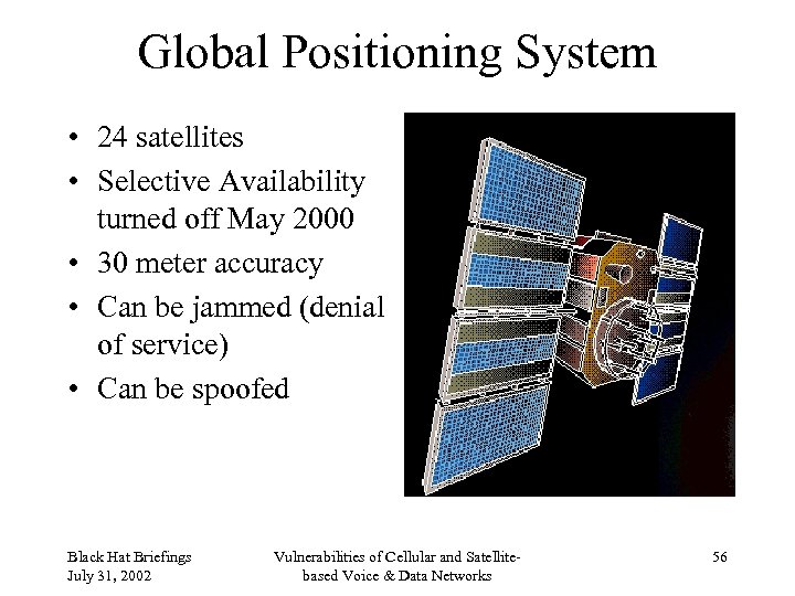 Global Positioning System • 24 satellites • Selective Availability turned off May 2000 • 30 meter accuracy • Can be jammed (denial of service) • Can be spoofed Black Hat Briefings July 31, 2002 Vulnerabilities of Cellular and Satellitebased Voice & Data Networks 56