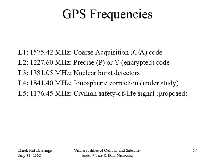 GPS Frequencies L 1: 1575. 42 MHz: Coarse Acquisition (C/A) code L 2: 1227. 60 MHz: Precise (P) or Y (encrypted) code L 3: 1381. 05 MHz: Nuclear burst detectors L 4: 1841. 40 MHz: Ionospheric correction (under study) L 5: 1176. 45 MHz: Civilian safety-of-life signal (proposed) Black Hat Briefings July 31, 2002 Vulnerabilities of Cellular and Satellitebased Voice & Data Networks 57