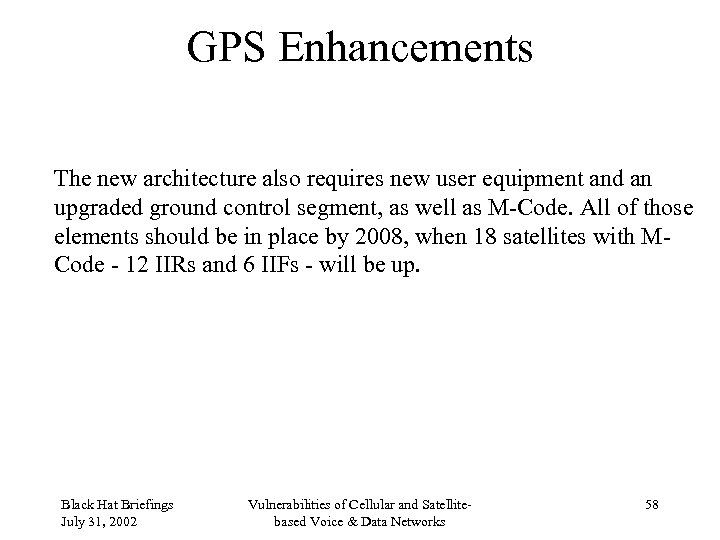 GPS Enhancements The new architecture also requires new user equipment and an upgraded ground control segment, as well as M-Code. All of those elements should be in place by 2008, when 18 satellites with MCode - 12 IIRs and 6 IIFs - will be up. Black Hat Briefings July 31, 2002 Vulnerabilities of Cellular and Satellitebased Voice & Data Networks 58