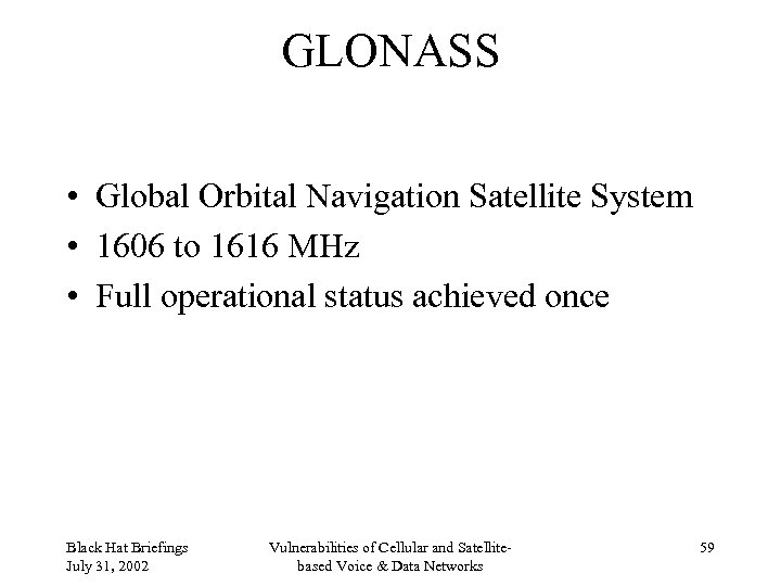 GLONASS • Global Orbital Navigation Satellite System • 1606 to 1616 MHz • Full operational status achieved once Black Hat Briefings July 31, 2002 Vulnerabilities of Cellular and Satellitebased Voice & Data Networks 59