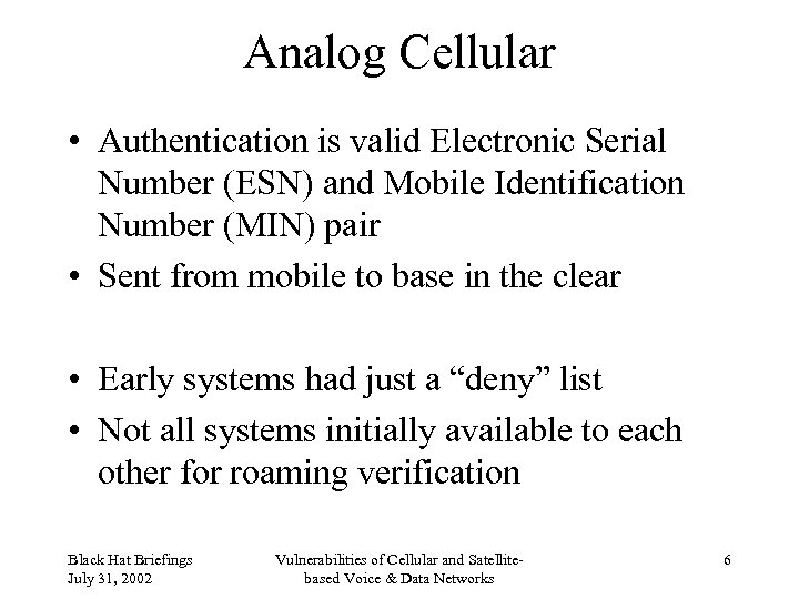 Cellular Signaling • Control channel – Forward is continuous – Reverse is shared • Voice (Traffic) channel – Assigned for the call – Shared in digital systems Black Hat Briefings July 31, 2002 Vulnerabilities of Cellular and Satellitebased Voice & Data Networks 5
